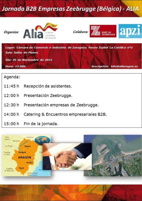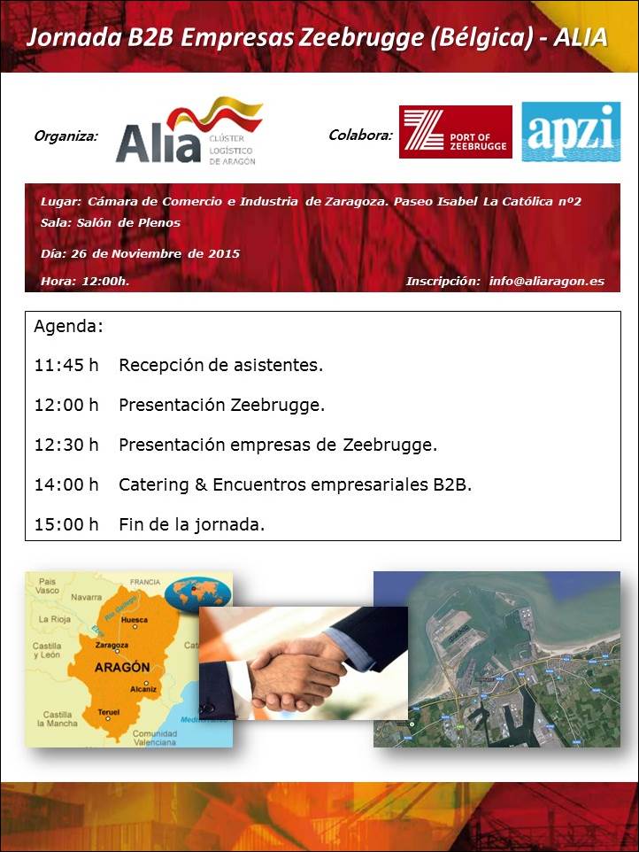 El próximo jueves 26 de noviembre, el Clúster Logístico de Aragón, Alia, organiza un encuentro en la Cámara de Comercio e Industria de Zaragoza con una representación de empresas belgas de la zona de Zeebrugge.