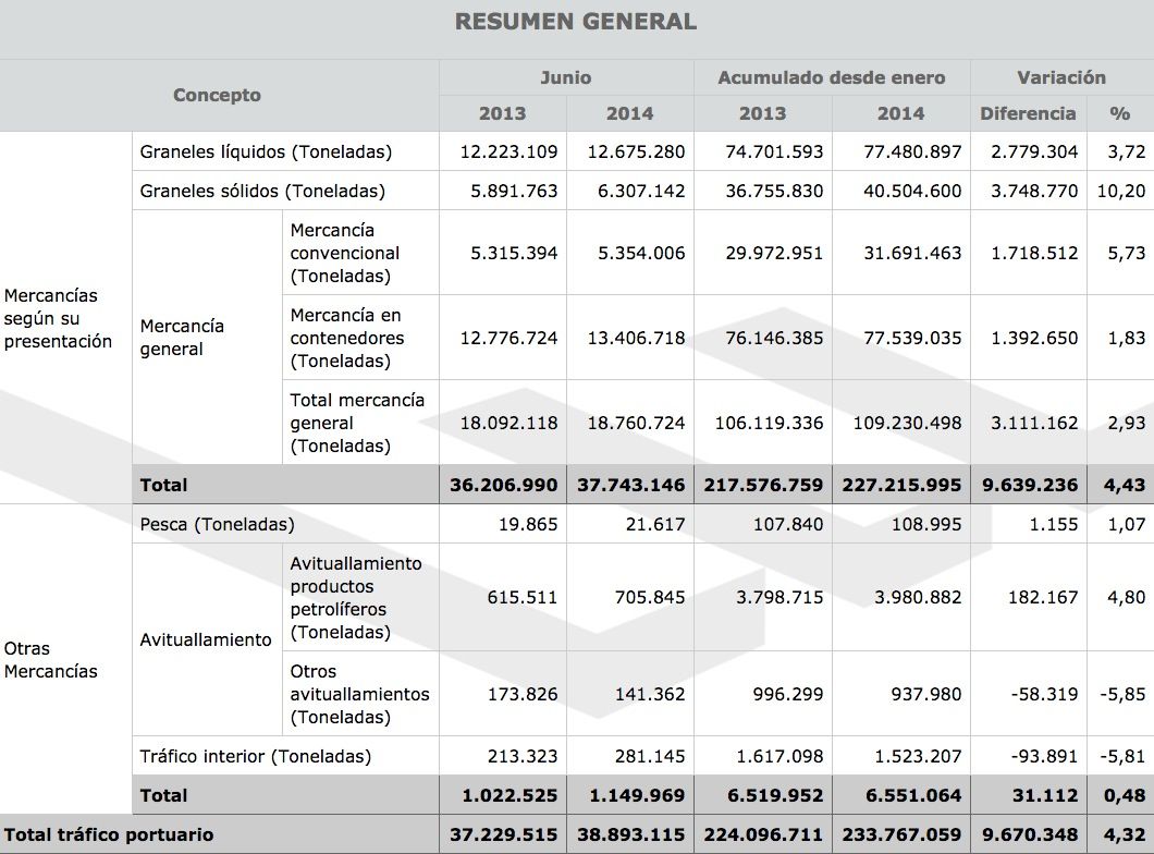En junio, el tráfico portuario español ha crecido por sexto mes consecutivo y ha alcanzado las 233.767.059 toneladas, con un incremento del 4,3% respecto al primer semestre de 2013.
