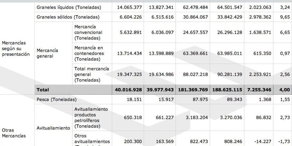 Finalmente, la mercancía general, el grupo más numeroso con más de 109 millones de toneladas, ha crecido cerca del 3%, propiciado por el incremento de tráficos de productos como el de maderas y corcho, tabaco, café, aparatos, herramientas o repuestos.