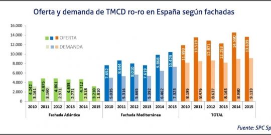 Sin tener en cuenta el ferrocarril ni los flujos con Portugal, el TMCD ro-ro alternativo a la carretera captó en España en 2014, último año del que se disponen de datos completos, el 10% de la demanda de transporte internacional, un registro mayor que el de 2014, cuando captó el 9,5%.