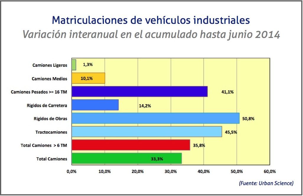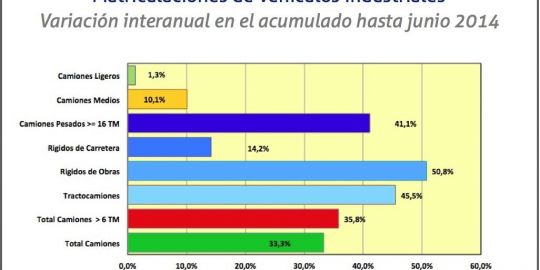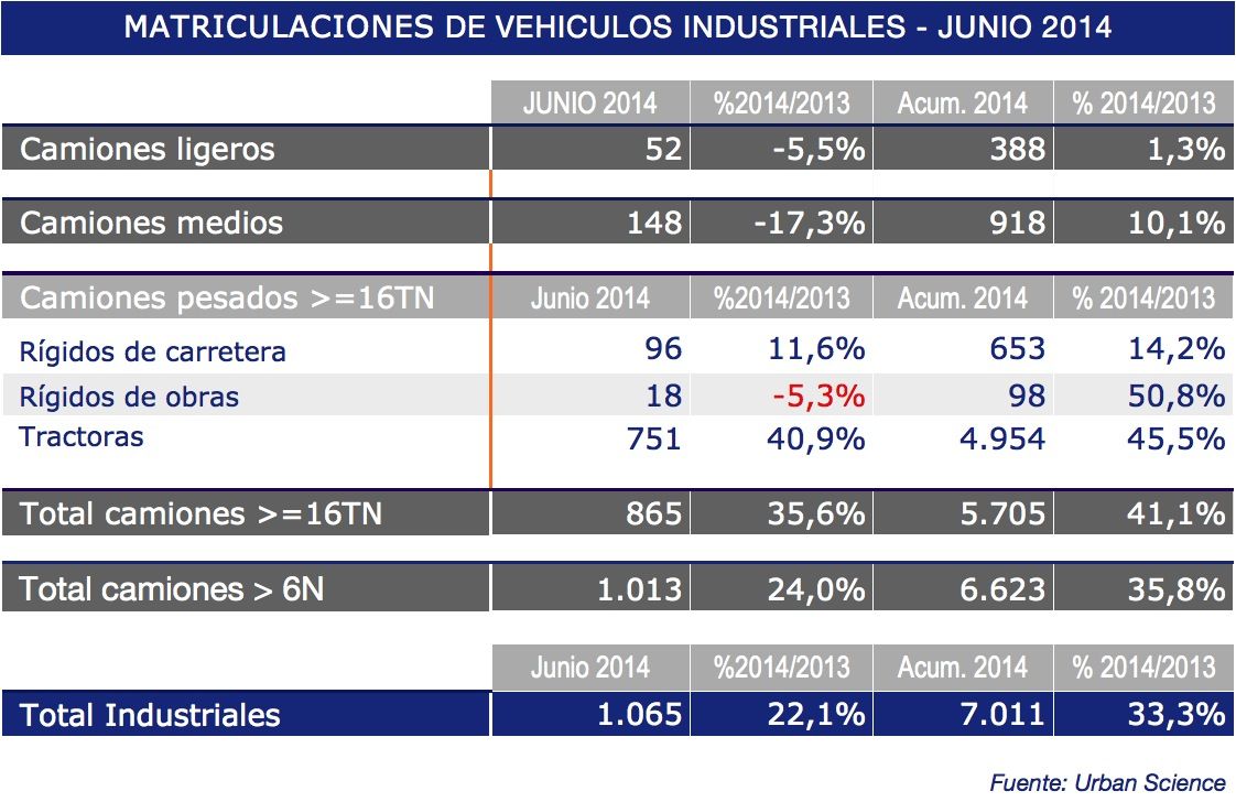 El mercado de vehículos industriales en junio ha registrado un crecimiento del 22,1% en comparación con junio de 2013, consiguiendo trece meses consecutivos de crecimiento, y ha recogido un aumento en todos los segmentos, excepto en el de los camiones ligeros, con un 5,5 menos y medios, que ha registrado una bajada de matriculaciones del -17,3%, según los datos aportados por Aniacam.