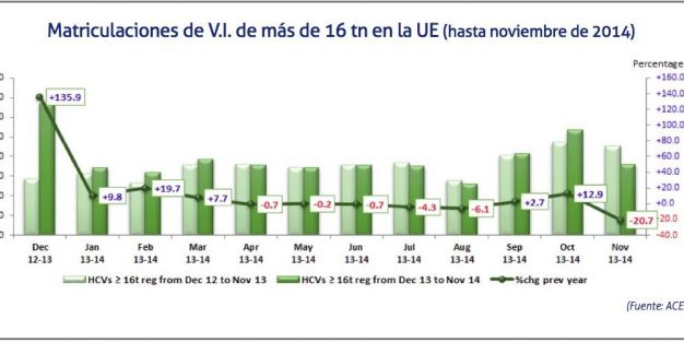 De enero a noviembre, se han registrado 258.342 unidades en la Unión Europa, un 1,1% menos que en el mismo período de 2013. Alemania (+4,2%), Italia (+4,8%) y España (+25,1%) han sido los países que más han crecido, mientras que las matriculaciones de camiones en Francia (-11,3%) y en el Reino Unido (-15,0%) han descendido.