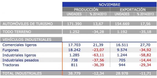 Asimismo, hay que destacar el incremento de la fabricación de vehículos comerciales e industriales que acumulan en los once primeros meses del año un crecimiento del 27,2% con un total de 475.179 vehículos.