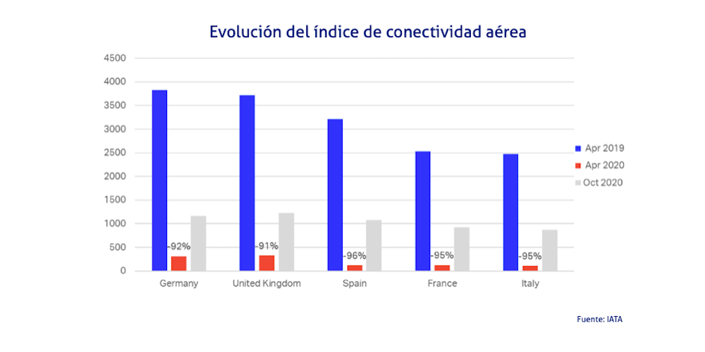 Sin embargo, el estudio de IATA también da cuenta de que desde el inicio de la pandemia la conectividad aérea se ha desplomado a escala planetaria, principalmente a causa de la práctica eliminación de los flujos internacionales de viajeros.