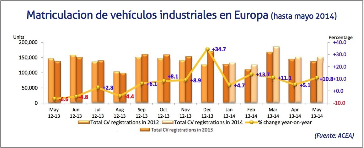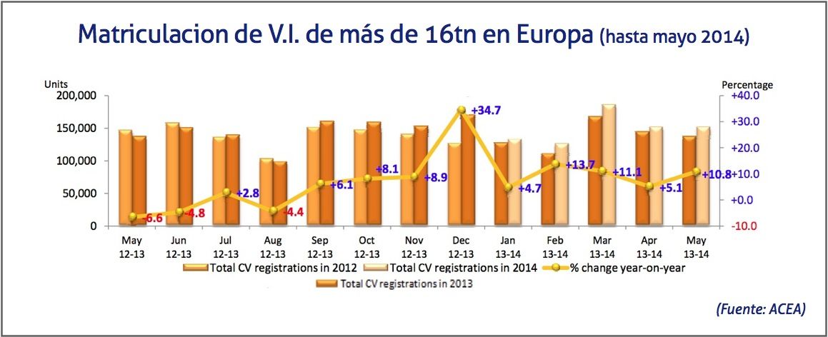 Entre los cinco primeros meses del año, el mercado de la Unión Europea ha crecido un 7,2%, alcanzando las 87.822 unidades. Este incremento ha sido posible por el crecimiento en el mercado español (+41,9%), Italia (+19,8%) y Alemania (+19,1%) mientras que las matriculaciones de vehículos industriales en Francia (-4,8%) y en Reino Unido (-28,1%) han caído.