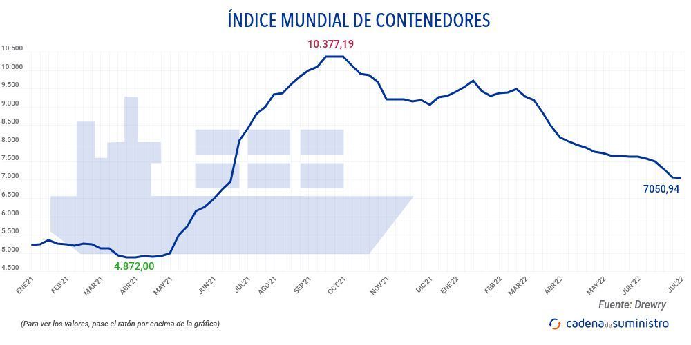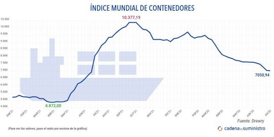 El Índice Mundial de Contenedores elaborado por Drewry, que evalúa las tasas de carga de contenedores en las ocho rutas principales hacia y desde Estados Unidos, Europa y Asia, se ha reducido apenas un 0,2% en la última semana, con 7.050,94 dólares/FEU (6.984,06 euros). La cifra se sitúa un 20% por debajo del nivel del año anterior por estas fechas. Además, la media actual se encuentra en 8.370 dólares (8.291 euros), un 138,32% por encima de los 3.512 (3.479euros) que se habían registrado para estas mismas fechas en 2021. Los precios entre Shanghái y Génova se han mantenido estables en 10.851 dólares (10.392 euros), igual que los de las líneas entre Shanghái y Rotterdam, en este caso en los 9.280 dólares (8.823 euros). Por su parte, entre Shanghái y Los Ángeles se han reducido un 1% hasta los 7.566 dólares (7.306 euros), mientras que entre Shanghái y Nueva York continúan en el entorno de los 10.175 (9.695 euros). En cuanto a las líneas entre Rotterdam y Nueva York, las tasas de carga prácticamente no han variado y se encuentran en los 6.801 dólares (6.476 euros). Desde la consultora, confían en que las tasas se mantengan a la baja en las próximas semanas.
