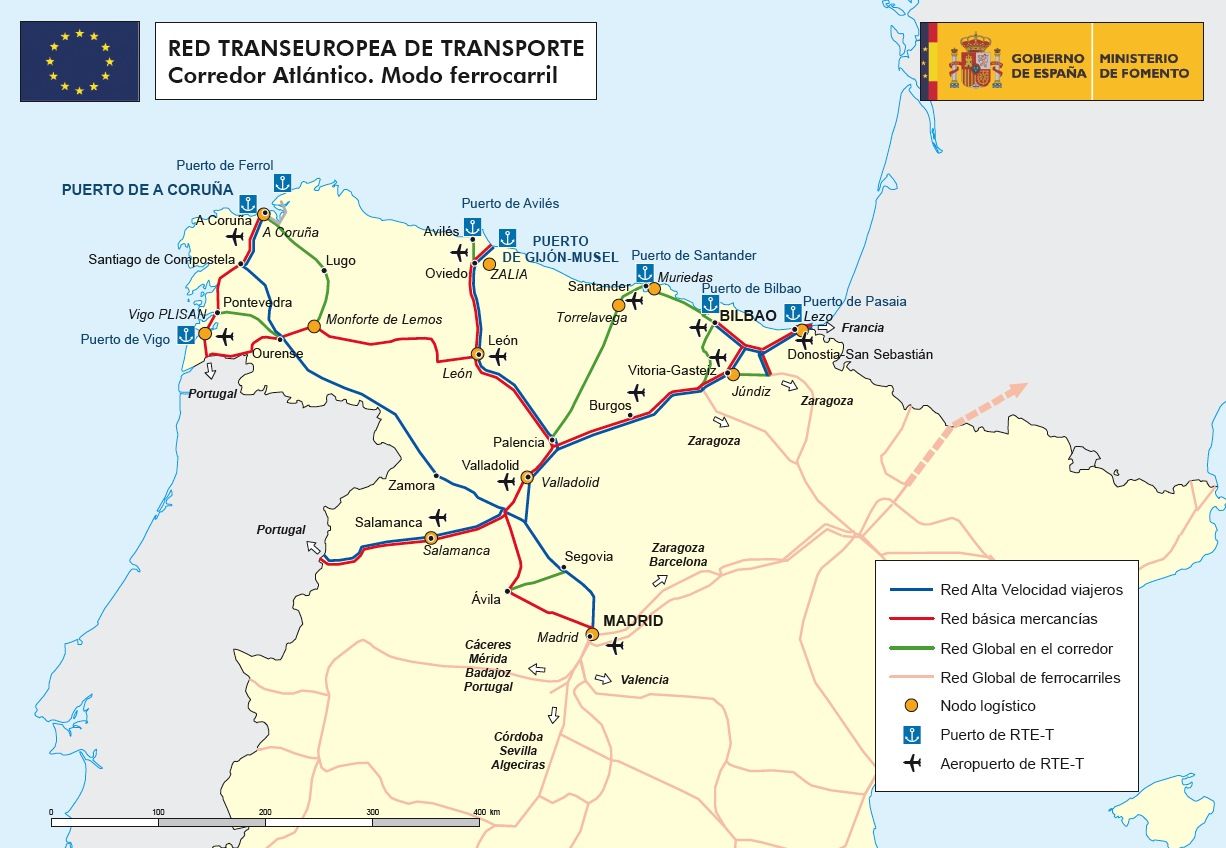 • Un eje Lisboa-Estrasburgo, que en España comprende el denominado Corredor Atlántico y que vertebra todo el oeste español, desde la frontera portuguesa hasta Irún.