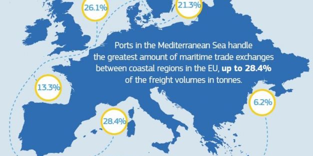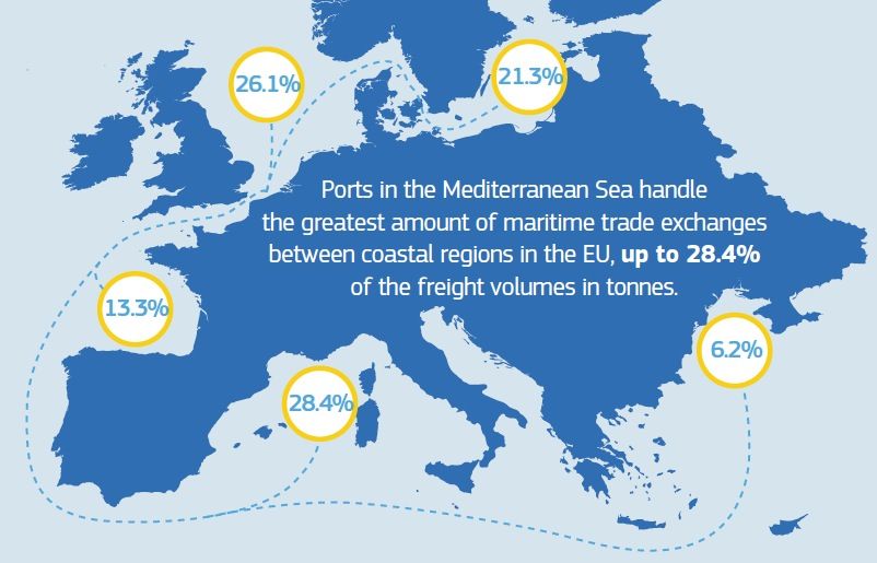 Actualmente, el 37% del intercambio intracomunitario de bienes, medido en tn/km, pasa a través de los puertos de la UE. En este intercambio, el 28,4% de las operaciones corresponde a puertos bañados por el Mar Mediterráneo, y el 13,3% a la costa de cantábrica, lo que pone de manifiesto la ubicación estratégica de España en el sector.