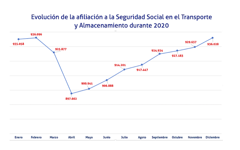 Así, por ejemplo, por lo que respecta al volumen de afiliados a la Seguridad Social en el transporte y almacenamiento, 2020 se abrió con una cifra de 935.058 personas.