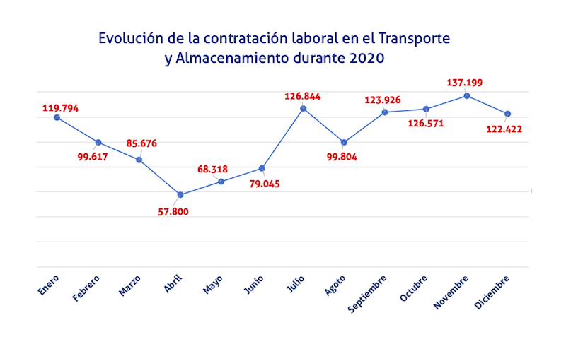 En concreto, 2020 arrancaba con un volumen 119.794 contrataciones en el transporte y almacenamiento. El primer trimestre fue nefasto y se alcanzó el menor nivel del ejercicio en abril, con apenas 57.800 contratos de trabajo.
