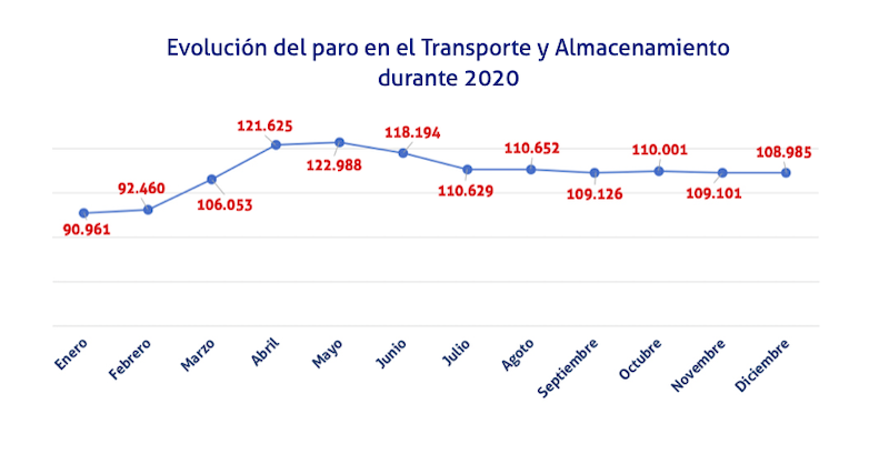 El año daba comienzo con un total de 90.961 trabajadores en paro y se disparaba en mayo hasta los 122.988. Desde ese punto se registró un descenso en los dos meses siguientes, pero desde agosto la reducción en el paro es poco perceptible y termina 2020 con un total de 108.985 trabajadores del sector logístico y de transporte en paro, un 27,75% más que en el último mes de 2019.