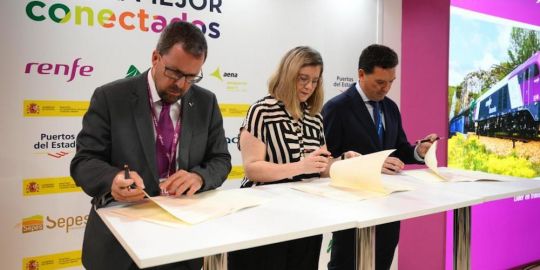 El presidente de Renfe, Raül Blanco, la presidenta de Adif, María Luisa Domínguez, y el presidente de la Autoridad Portuaria de Huelva, Manuel Alberto Santana, han firmado en el SIL un protocolo para la puesta en marcha de una Autopista Ferroviaria en ancho ibérico entre Huelva y Madrid y su prolongación futura a Zaragoza. Actualmente, el corredor Huelva-Madrid-Zaragoza registra un elevado volumen de transporte de mercancías por carretera, procedente fundamentalmente de Canarias y otros destinos, así como producción interna de la provincia de Huelva. Parte importante de este transporte proviene de la modalidad ro-ro procedente de las Autopistas del Mar, que es susceptible de continuar su recorrido por ferrocarril mediante los servicios de Autopista Ferroviaria. El objetivo es impulsar el transporte eficiente de mercancías por ferrocarril, mediante la carga en el tren de semirremolques procedentes de la carretera, dotando así al Corredor Huelva-Madrid-Zaragoza, en ancho convencional, del máximo aprovechamiento ferroviario. El servicio supondrá, además, un importante ahorro, tanto en costes externos como en emisiones, promoviendo una movilidad más sostenible, inteligente, competitiva y segura. Adif realizará actuaciones relacionadas con los gálibos en túneles, pasos superiores, puentes, estaciones y elementos de electrificación para responder a las necesidades del transporte de semirremolques tipo P400 sobre vagones tipo poche. Renfe Mercancías, por su parte, dispondrá de vagones especializados para la carga de semirremolques en ancho ibérico para realizar, inicialmente, un tráfico diario de ida y vuelta entre Huelva y Madrid, mediante trenes eléctricos de cero emisiones. El proyecto requiere de terminales de carga con vías para el tratamiento del tren, una zona para el estacionamiento de semirremolques y medios operativos para su traslado y carga/descarga de los vagones. La terminal de destino sería inicialmente la de Abroñigal, hasta finalizar las obras que Adif está ejecutando en Vicálvaro. En cuanto a la terminal de origen, el puerto de Huelva dispone de instalaciones específicas ferroportuarias en las que realizar las operaciones al tren y la carga/descarga de UTI.