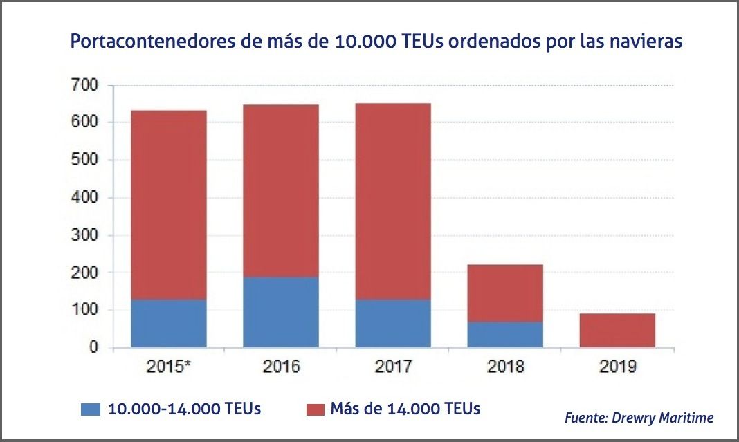 A partir de mayo y hasta finales de 2015, serán entregados a los operadores un total de 630.000 TEUs de capacidad en nuevos buques de más de 10.000 TEU, con unos niveles similaresprevistos para 2016 y 2017. Entre ellos, con toda probabilidad, los buques de más de 14.000 TEUs serán incorporados al comercio Asia-Europa, lo que supone incrementar la oferta 503.000 TEUs, sólo en este 2015.