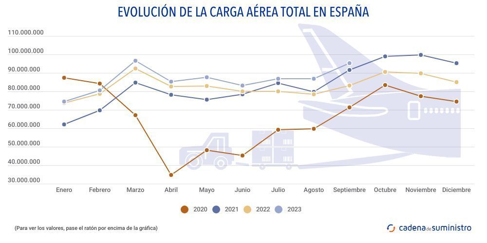 Durante el pasado mes de septiembre, el sistema aeroportuario español ha movido un volumen mensual de 95.195.963 kg de mercancías, un 14,6% más que en el noveno mes de 2022.