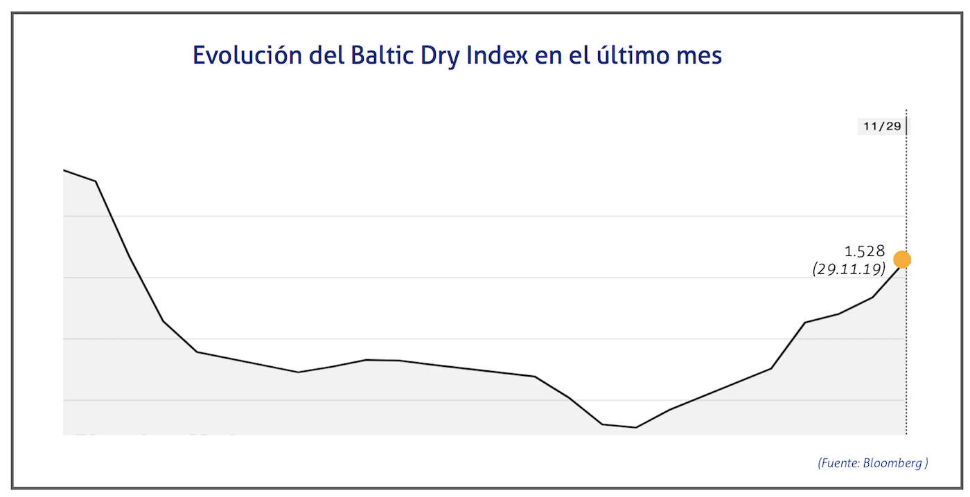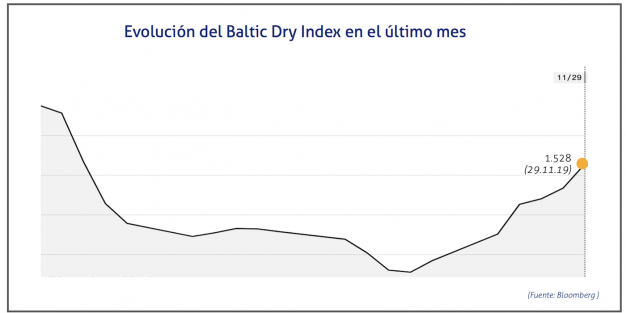 El Baltic Dry Index, BDI, que refleja los precios de los fletes de los buques graneleros tomando como referencia un total de 23 rutas marítimas, se ha situado el viernes 29 de noviembre de 2019 en los 1.528 puntos, lo que supone un ascenso de 61 puntos o del 4,16%.