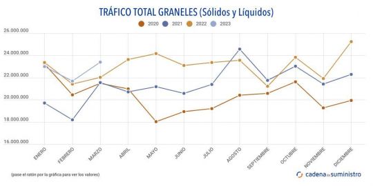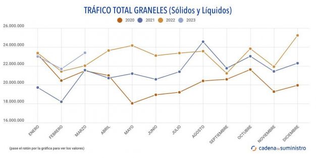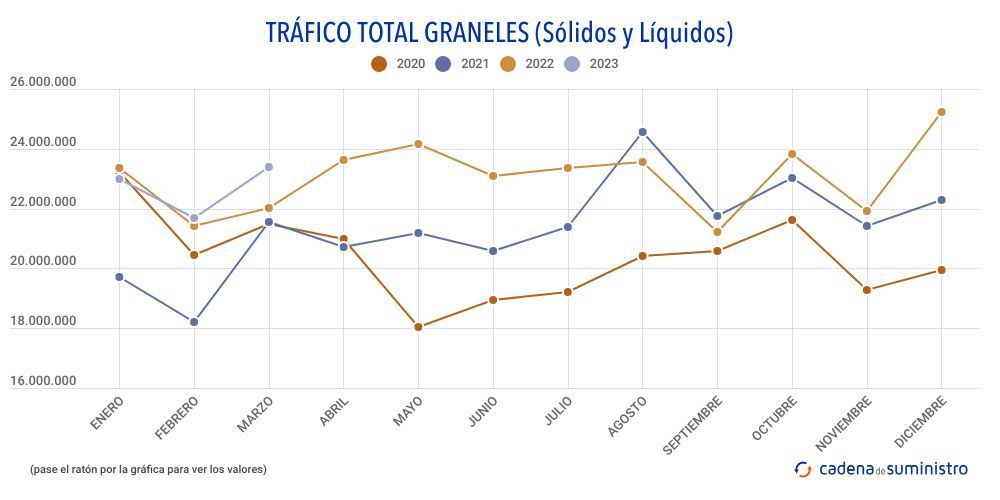 En todo el primer trimestre de 2023, el sistema portuario del país totaliza 44.465.010 toneladas de graneles líquidos, un 0,44% más que hace un año, y 23.581.058 toneladas de graneles sólidos, un 5,19% anual más.