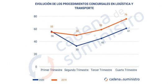 Así pues, en el cuarto trimestre de 2020, se han producido 61 procedimientos concursales en el transporte y la logística, un 35,56% más que entre julio y septiembre del año pasado, pero un 19,74% menos que en los tres últimos meses de 2019.
