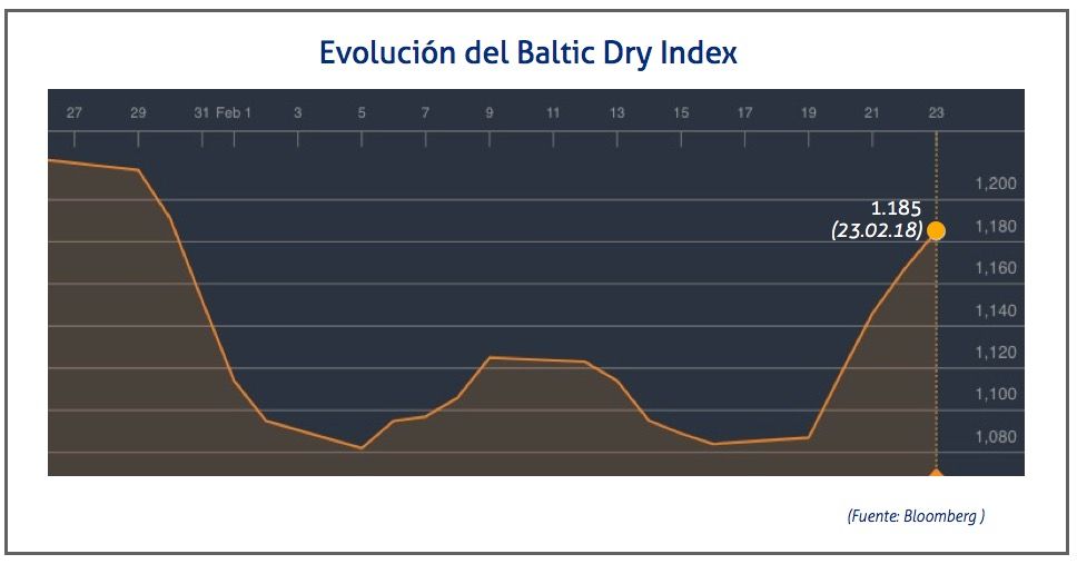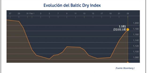 Desde el 16 de febrero, cuando el BDI rozó mínimos anuales, no ha dejado de aumentar, pasando de los 1.084 puntos hasta los 1.185 actuales en apenas una semana. Esto implica un crecimiento del 9,31%.