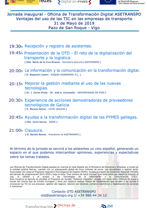 Como avance, durante la jornada se analizará el reto de la digitalización para el sector del transporte y la logística, además de la mejora de la información y la comunicación a través de las nuevas tecnologías. Por otro lado, se presentarán las ayudas a la transformación digital de las pymes gallegas.