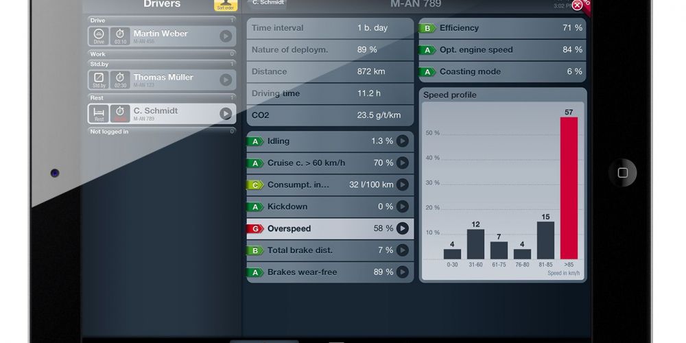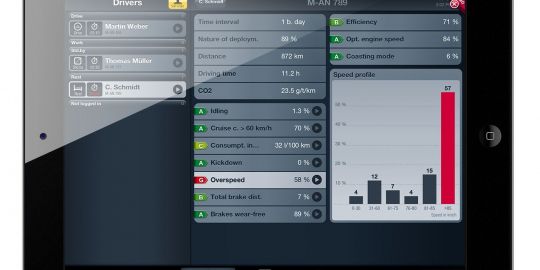 Los usuarios siempre tienen una visión general de los vehículos y así pueden saber cuando requieren mantenimiento y cuando los conductores necesitan formación. La aplicación hace posible el acceso a los informes cuyos gráficos de barras de color muestran rápidamente la eficiencia de las operaciones en los vehículos.