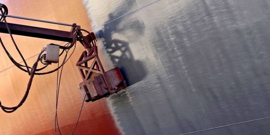 Su trabajo consiste en retirar las viejas capas de pintura con agua a presión, para después aplicar nuevamente pintura. Con este sistema se puede pintar hasta el 77% de los aproximadamente 9.300 m² de superficie de cada embarcación.