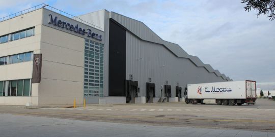 La plataforma de Mercedes-Benz en Miralcampo, que ocupa una superficie total de 212.000 m², con unos 50.000 m² construidos para almacén, recepcionan entre diez y doce camiones cada día.