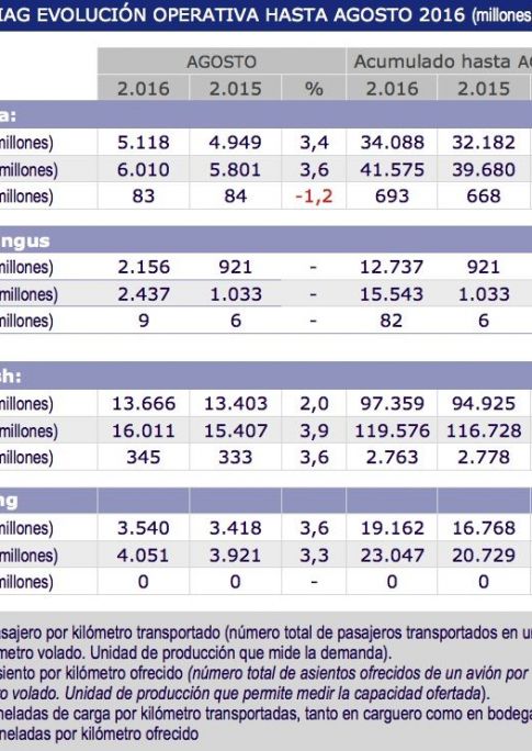 El grupo IAG ha publicado los resultados de agosto de 2016, mes en el que el tráfico de mercancías, con una TKT Carga (toneladas de carga por kilómetro transportadas) de 437 millones de toneladas, asciende un 3,3% con respecto al mismo mes de 2015.