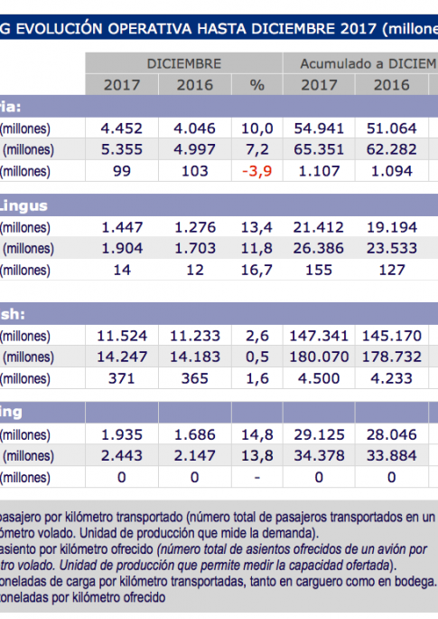 Al tiempo, la demanda del grupo medida en pasajeros-kilómetro transportados se ha incrementado un 8,6% en el duodécimo mes de 2017, y el volumen de oferta, medido en número de asientos-kilómetro ofertados, ha crecido un 4% en dicho mes.