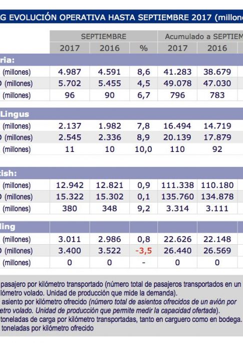 Mientras tanto, la demanda del grupo medida en pasajeros-kilómetro transportados se ha incrementado un 3,1% en el noveno mes de 2017, y el volumen de oferta, medido en número de asientos-kilómetro ofertados, ha crecido un 1,3%.