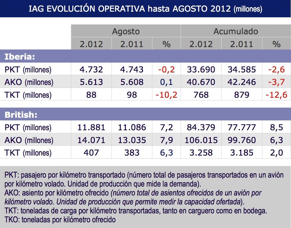 Frente a las cifras en descenso de Iberia, British Airways sigue mostrando cifras en positivo, en las toneladas de carga por kilómetro transportadas ha crecido un 7,2%. En cuanto a la demanda, esta ha aumentado un 7,9% y la oferta un 6,3%. En el periodo de enero a agosto, la aerolínea ha registrado un crecimiento en todos sus sectores. En cuanto a la oferta ha alcanzado un 8,5%, y la demanda ha crecido un 6,3%. Por su parte la carga ha aumentado ligeramente con una subida de 2,0%.