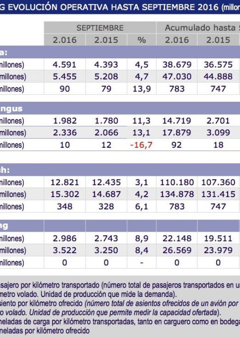 El grupo IAG ha publicado los resultados de septiembre de 2016, mes en el que el tráfico de mercancías, con una TKT Carga (toneladas de carga por kilómetro transportadas) de 448 millones de toneladas, asciende un 6,9% con respecto al mismo mes de 2015.