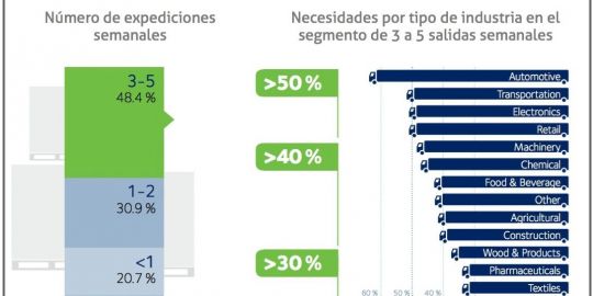 Por otro lado, el informe determina que casi la mitad del número de salidas por semana suponen entre tres y cinco expediciones. Mientras que menos de una expedición a la semana suponen el 20,7% del total. La industria que demanda con más de un 60% las expediciones entre tres y cinco son las piezas de automoción, seguido con un 50% del transporte y de las electrónica.