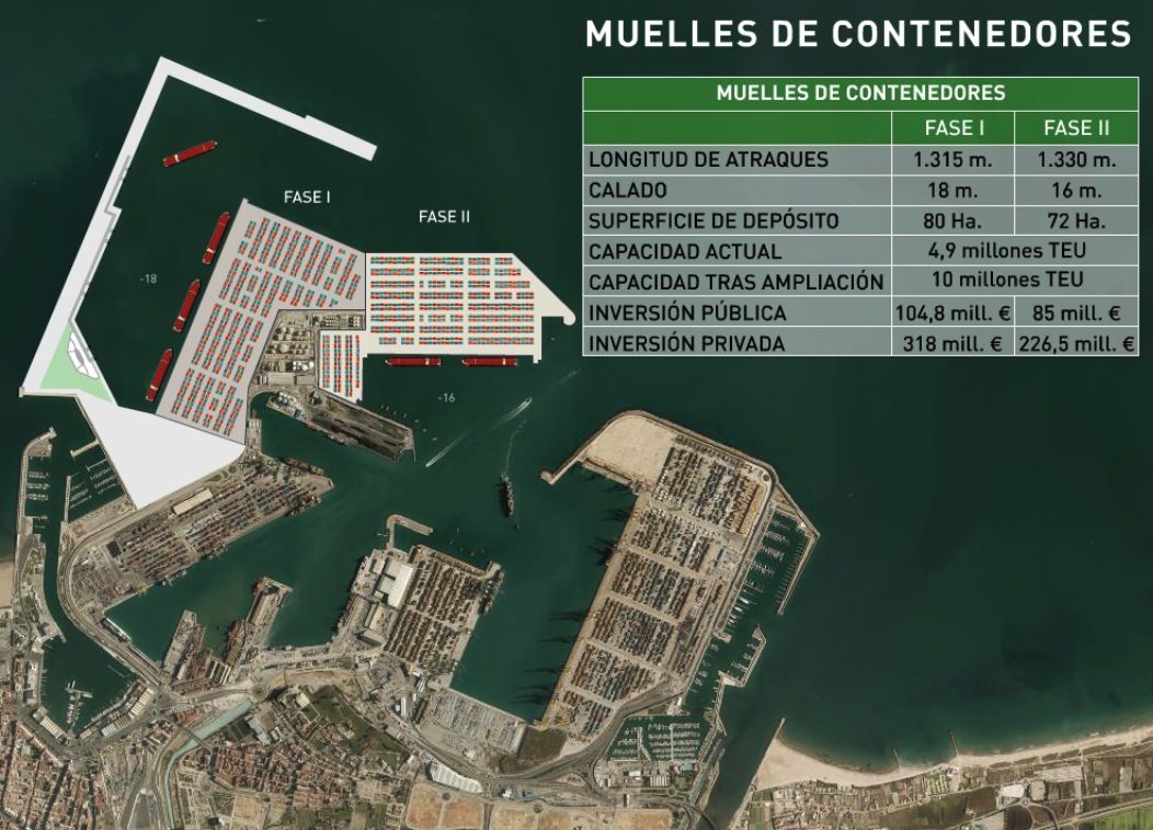 La ampliación para terminal de contenedores, se ejecutará en dos fases. En la primera fase, se generarán 1.350 m de nuevos atraques, con calados de 18 m, 80 Ha de superficie de depósito. La inversión pública en este caso es de 104,8 millones de euros, mientras que la aportación privada es de 318 millones de euros.