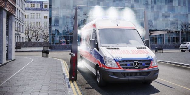 La desinfección exterior de vehículos sanitarios y flotas de los cuerpos de seguridad, se realiza mediante arcos con una capacidad de desinfección de unos 1.000 vehículos diarios. El sistema ha sido diseñado para rociar los vehículos con producto biocida y logra desinfectar hasta los de grandes dimensiones.