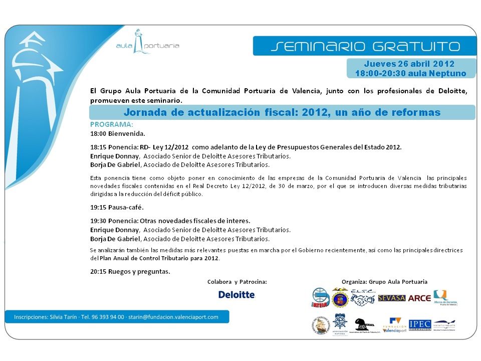 Esta ponencia tiene como objetivo poner en conocimiento de las empresas de la Comunidad Portuaria de Valencia las principales novedades fiscales contenidas en el Real Decreto Ley 12/2012, de 30 de marzo, por el que se introducen diversas medidas tributarias dirigidas a la reducción del déficit público.