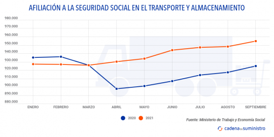 Así mismo, la variación interanual con relación a septiembre de 2020 registra una incremento de un 3,87% en las afiliaciones en el transporte y la logística, lo que se traduce en 27.680 trabajadores más inscritos en este régimen que hace un año.