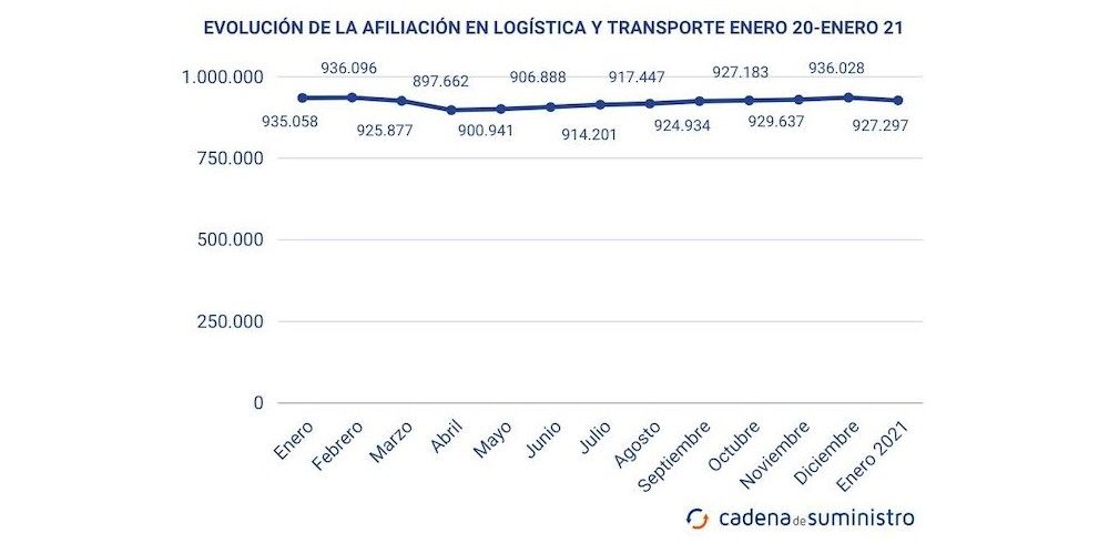 Así mismo, la variación interanual con relación a enero de 2020 registra una caída de un 2,15% en las afiliaciones en el transporte y la logística, lo que se traduce en 9.268 trabajadores menos inscritos en este régimen que hace un año.