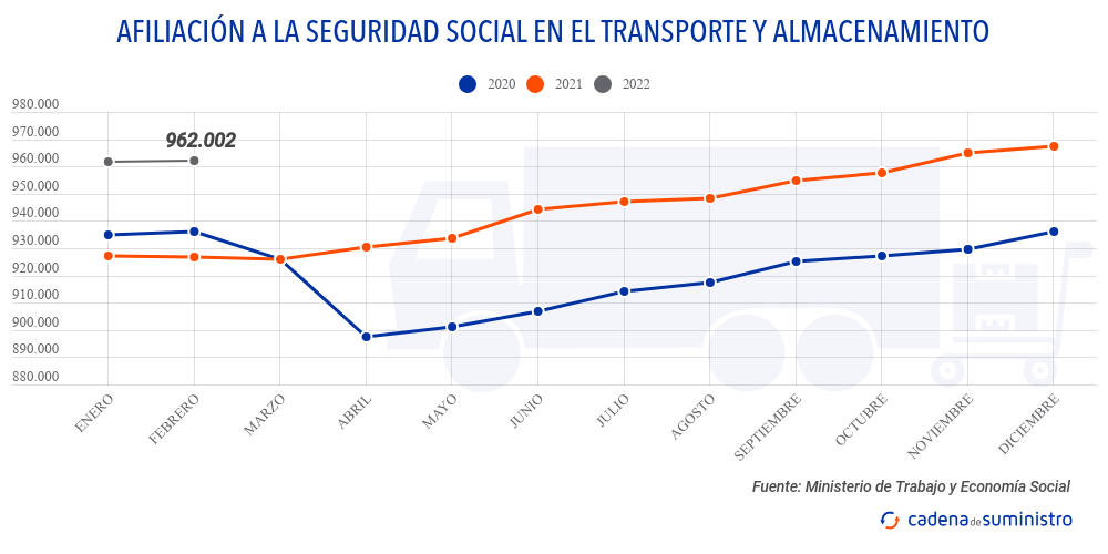 Entre los afiliados al Régimen General y al especial de Autónomos, en febrero han cotizado a la Seguridad Social un total de 962.002 trabajadores en el sector de transporte y logística en España, un 0,04% más que en enero, es decir, 411 personas más.