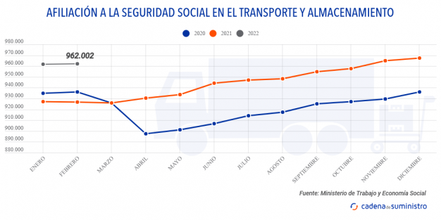 Así mismoo, la variación interanual con relación a febrero de 2021 registra una incremento de un 5,27% en las afiliaciones del régimen general en el transporte y la logística, lo que se traduce en 37.593 trabajadores más inscritos en este régimen que hace un año.