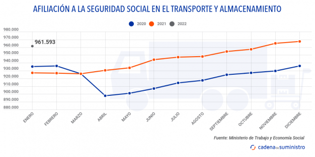 Sin embargoo, la variación interanual con relación a enero de 2021 registra una incremento de un 5,02% en las afiliaciones del régimen general en el transporte y la logística, lo que se traduce en 35.931 trabajadores más inscritos en este régimen que hace un año.
