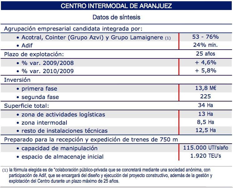Adif ha comenzado el procedimiento negociado con la agrupación empresarial candidata a constituir la sociedad que se encargará del diseño, construcción y explotación del Centro Logístico Intermodal en Aranjuez (Madrid), mediante una iniciativa fórmula de colaboración público-privada. Se trata de una fórmula contrastada a nivel internacional, entre las administraciones públicas y el sector privado para el desarrollo y modernización de infraestructuras y servicios públicos de interés estratégico.