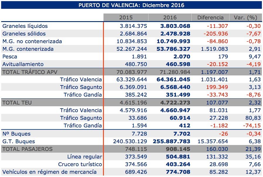 La Autoridad Portuaria de Valencia ha concluido el año 2016 con un tráfico de contenedores de 4.722.273 TEUs, lo que representa un incremento del 2,32% y supone superar el mejor registro histórico de sus instalaciones hasta el momento.