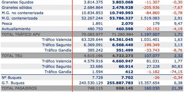 En cuanto al tráfico total, los puestos de Valencia, Sagunto y Gandía han experimentado un incremento del 1,71% respecto al ejercicio anterior, con un total de 71.280.984 toneladas manipuladas, lo que también implica una mejora respecto a la mejor cifra alcanzada hasta el momento.