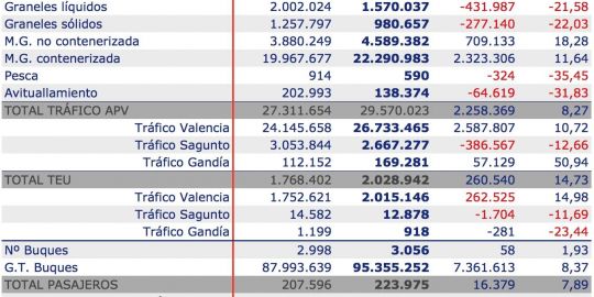 Del mismo modo, los tres puertos gestionados por la Autoridad Portuaria de Valencia, Valencia, Sagunto y Gandía, han movido 2.015.146 TEUs, dato que supone un alza del 13,95%. En este apartado crece tanto la carga (+9,17%%) como la descarga (+13,29%). La mercancía general en contenedor avanza un 11,64% hasta un total de 22,29 millones de toneladas.