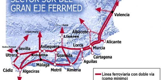 Andalucía requiere, por su extensión geográfica y su importancia socioeconómica, el pleno desarrollo en ancho internacional tanto del Corredor Atlántico como del Mediterráneo y la conclusión del eje transversal desde Huelva hasta Almería.