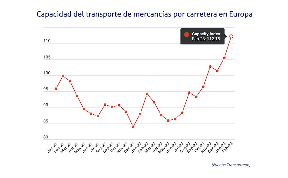 La capacidad disponible en el transporte europeo crece casi constantemente desde mayo de 2022, cuando tocó fondo, y tras retroceder en octubre y diciembre, para colocarse en sus valores máximos de los dos últimos años.