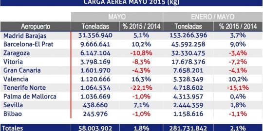 Durante el mes de mayo, los aeropuertos españoles de la red de Aena han transportado 58.003.902 kg de carga aérea, un 1,8% más que en el mismo mes de 2014. En cuanto a los datos acumulados, el tráfico de carga ha ascendido a 281.731.842 kg, que suponen un 2,1% más que en el mismo período de 2014.