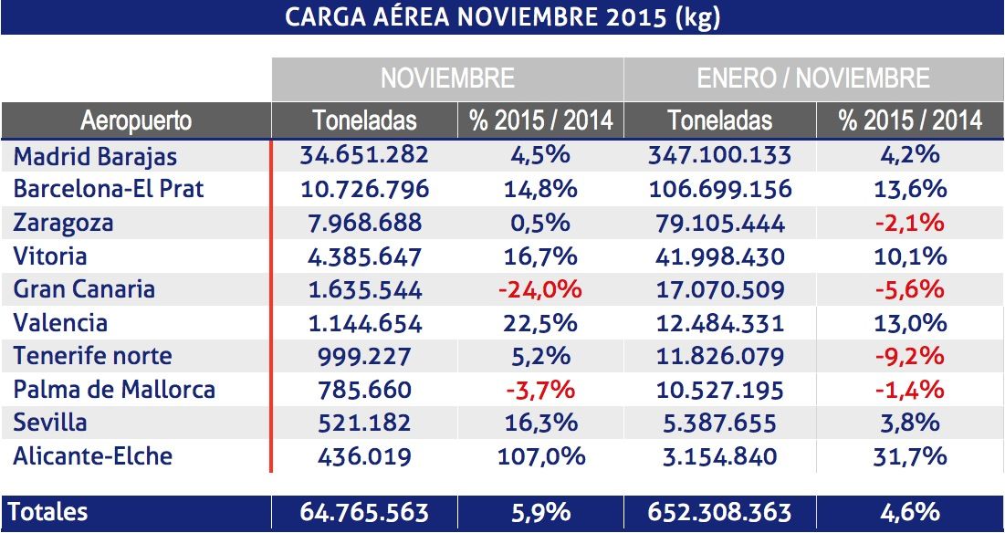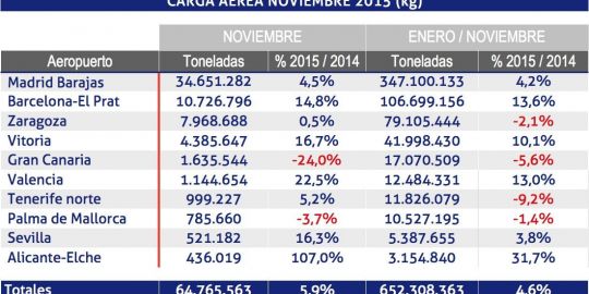 Durante el mes de noviembre, por los aeropuertos españoles de la red de Aena han pasado 64.765.563 kg de carga aérea, un 5,9% más que en el mismo mes de 2014. En cuanto a los datos acumulados, el tráfico de carga ha ascendido a 652.308.363 kg, que suponen un 4,6% más que en el mismo período de 2014.