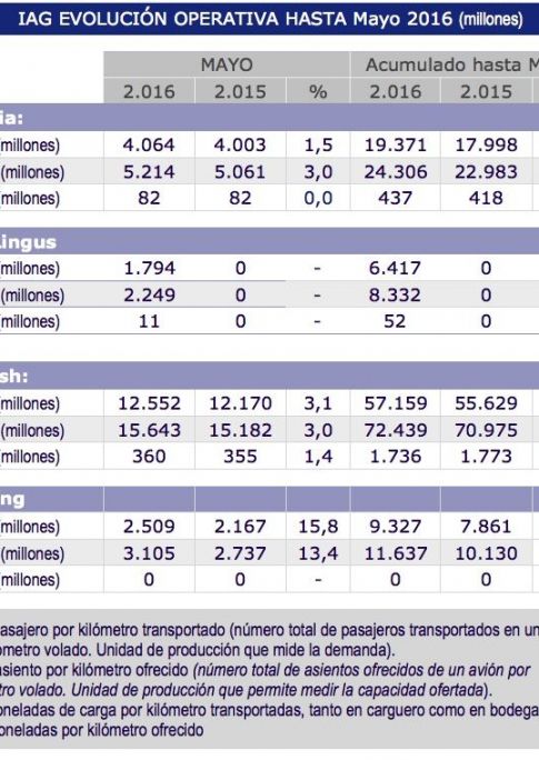 El grupo IAG ha publico los resultados del mes de mayo de 2016 en el que se recoge el tráfico de mercancías con una TKT Carga (toneladas de carga por kilómetro transportadas) de 453 millones de toneladas, lo que supone un aumento del 3,66% con respecto al mismo mes de 2015.