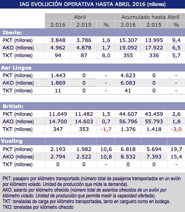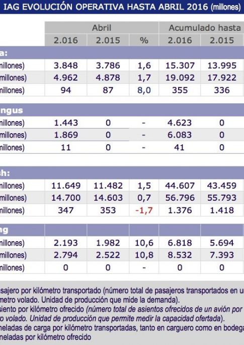 El grupo IAG Cargo ha publicado los resultados del mes de abril de 2016, en el que se recoge el tráfico de mercancías con una TKT Carga (toneladas de carga por kilómetro transportadas) de 452 millones de toneladas, lo que supone un incremento del 2,7% con respecto al mismo mes de 2015.